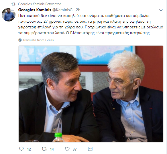 «Πατριωτικό δεν είναι να καπηλεύεσαι ονόματα, αισθήματα και σύμβολα, παγιώνοντας 27 χρόνια τώρα, σε όλα τα μήκη και πλάτη της υφηλίου, τη χειρότερη επιλογή για τη χώρα σου. Πατριωτικό είναι να υπηρετείς με ρεαλισμό τα συμφέροντα του λαού. Ο Γ. Μπουτάρης είναι πραγματικός πατριώτης».